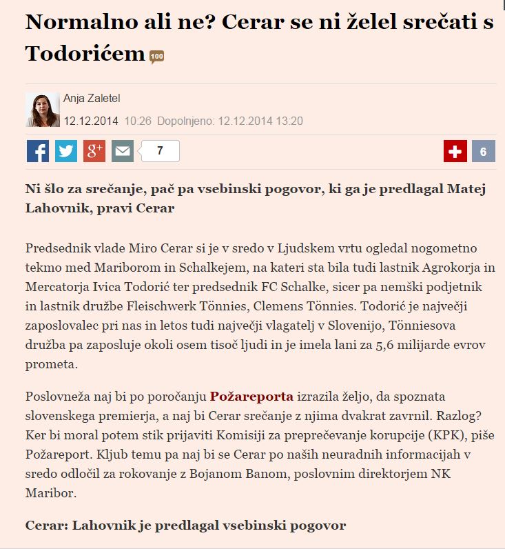 Na nogometni tekmi v mariborskem Ljudskem vrtu pa ni šlo za srečanje, pač pa je k predsedniku vlade prišel dr. Matej Lahovnik, član nadzornega sveta Mercatorja, in predlagal vsebinski pogovor z lastnikom Mercatorja in Agrokorja Ivico Todorićem ter nemškim podjetnikom in predsednikom nogometnega kluba Schalke Clemensom Tönniesom, pri katerem bi bil navzoč tudi on. Predlagan pogovor je premier in predsednik stranke SMC gospodu Lahovniku pred navzočimi vljudno zavrnil.”