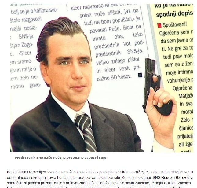 Pred leti so se poslanci SNS nekaznovano odločili, da se za tabloidne medije fotografirajo s pištolami v rokah. In to kar sredi parlamenta, menda v prostorih svoje poslanske skupine. Njihovo poziranje so potem objavili rumeni mediji, resni pa povzeli dogajanje. Sankcij ni bilo nobenih: