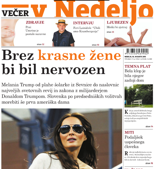 Včeraj sem naredil izjemo. Naslovnica z Melanio Trump zato ne preseneča, poudarek na besedilu o potencialni »first lady«, ki bo prihajala iz Sevnice, če bo njen mož morda postal ameriški predsednik, pa je že hudičevo predvidljiv. Kot da bi legitimacija ne zgolj za nastanek članka, temveč predvsem tabloidno naravnanost teme in prav takšno uporabo novinarskih tehnik, stekla iz naključnega dejstva o poreklu Trumpove žene in postala alibi za izbiro enega in drugega. Kajti če postane predsednik, potem bomo pa mi nekaj res pri tem imeli, kajne?